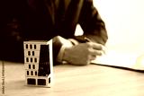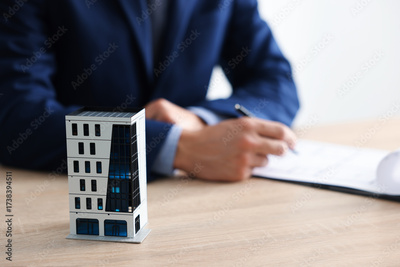 Real estate agent with paperwork at wooden table, focus on apartment building model