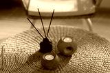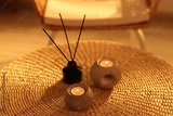 Burning candles and reed air freshener on wicker table indoors, closeup