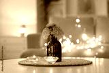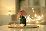 Burning candles and beautiful flowers on white table indoors, closeup. Bokeh effect