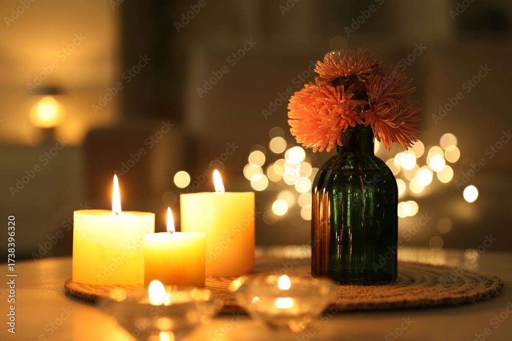 Burning candles and beautiful flowers on table indoors, closeup. Bokeh effect