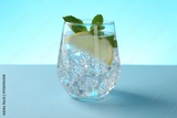 Refreshing water with lemon, mint and ice on table against light blue background