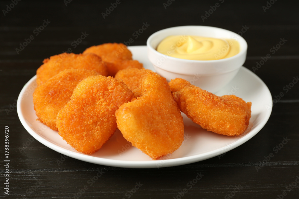 Tasty chicken nuggets with sauce on black wooden table, closeup
