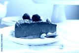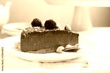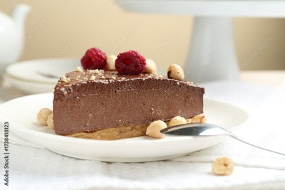 Piece of delicious chocolate cheesecake with nuts and raspberries on beige table, closeup