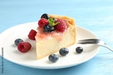 Piece of tasty cheesecake with berries and sauce on light blue wooden table, closeup