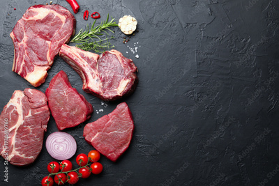 Pieces of raw beef meat, spices and tomatoes on black table, flat lay. Space for text