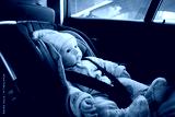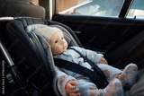 Baby sitting in an infant car seat, safety travelling by car with little child. Little baby fastened with seat belt in safety car seat. Road trip lifestyle child care transportation rear-facing.