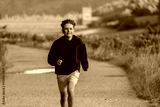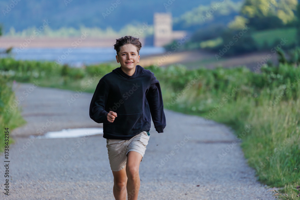 Boy in black hoodie run on scenic path along Howden reservoir