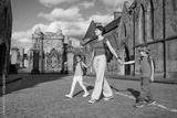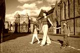 Leisurely family walk beside ancient castle entrance in Edinburg