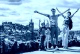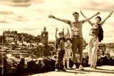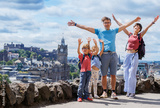 Happy family pose with arms raised over city's view of Edinburgh