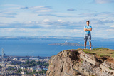Confident hiker stand on a steep cliff in Edinburgh, Scotland