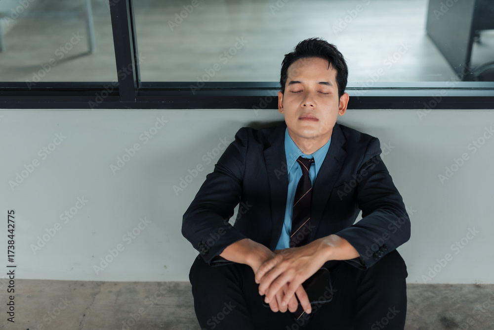 Asian businessman sitting on floor leaning against wall, feeling exhausted and stressed from overwork in office