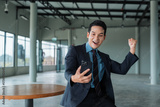 Happy young asian businessman receiving good news on smartphone, raising fist in empty modern office