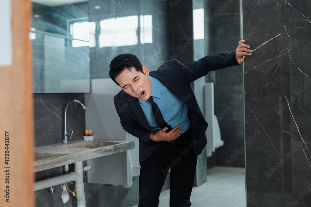 Businessman leaning against bathroom wall, experiencing intense abdominal pain and discomfort, likely from food poisoning or indigestion