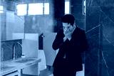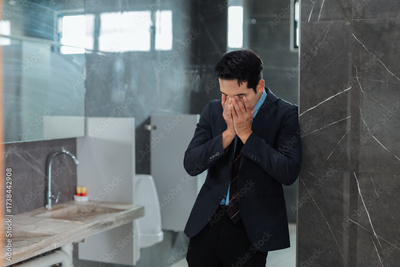 Businessman covering his face, experiencing stress and burnout in a public office restroom. He is feeling overwhelmed and emotional