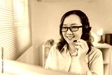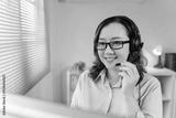 Asian woman wearing headset with microphone, smiling, providing customer support or working in a call center from home