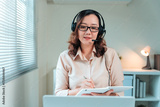 Woman in headset talking during a video conference, working remotely from home, writing notes in notebook