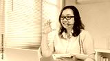 Woman wearing a headset, holding a pen and notebook, smiling during a virtual meeting or online learning session at home