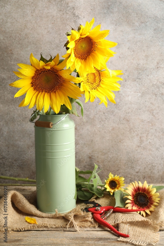 Beautiful sunflowers in can used as vase and secateurs on wooden table