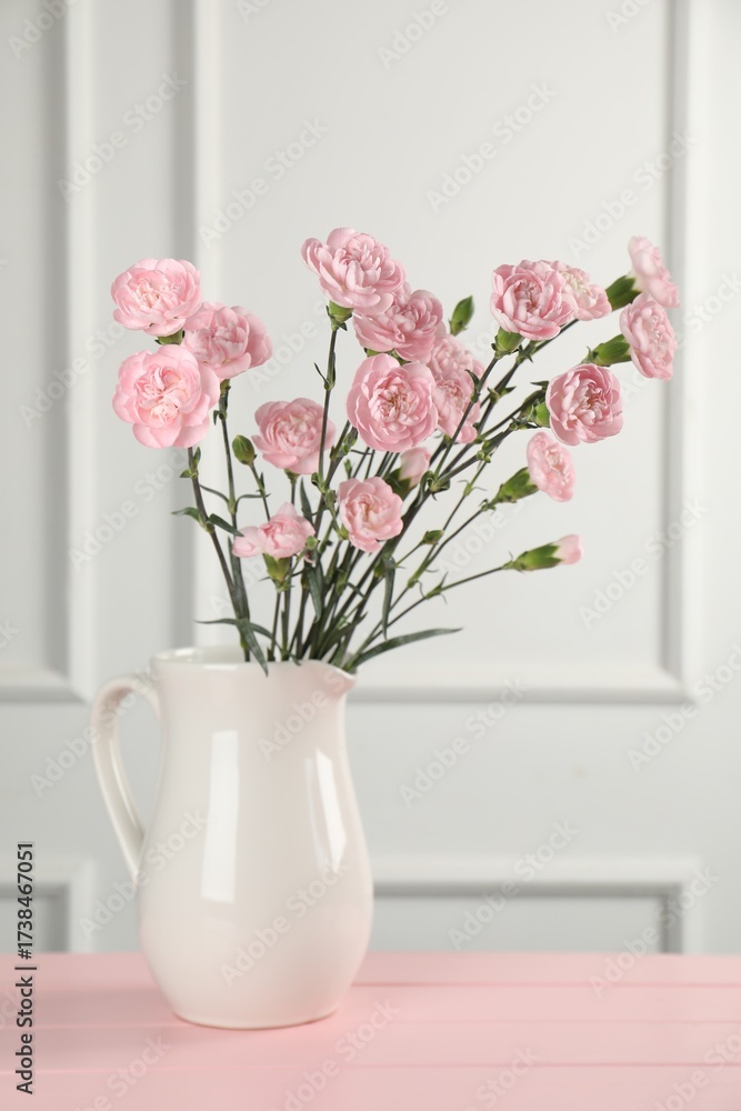 Beautiful carnation flowers in vase on pink wooden table near white wall indoors