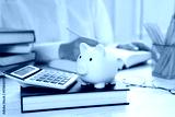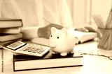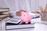 Piggy bank with calculator, book on white wooden table and woman working indoors, selective focus