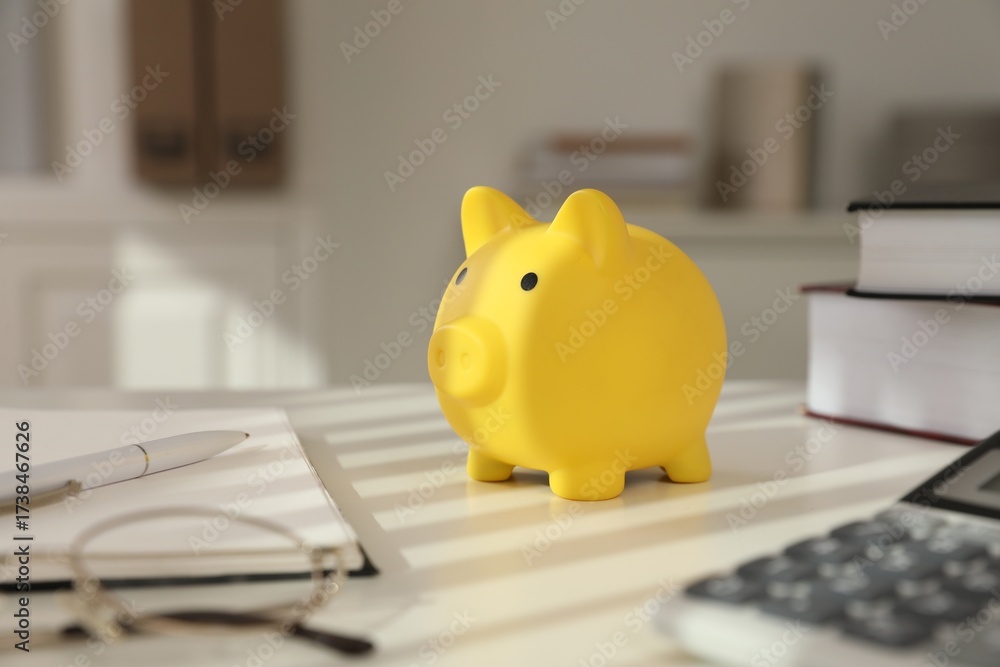 Piggy bank, calculator and books on white table indoors