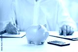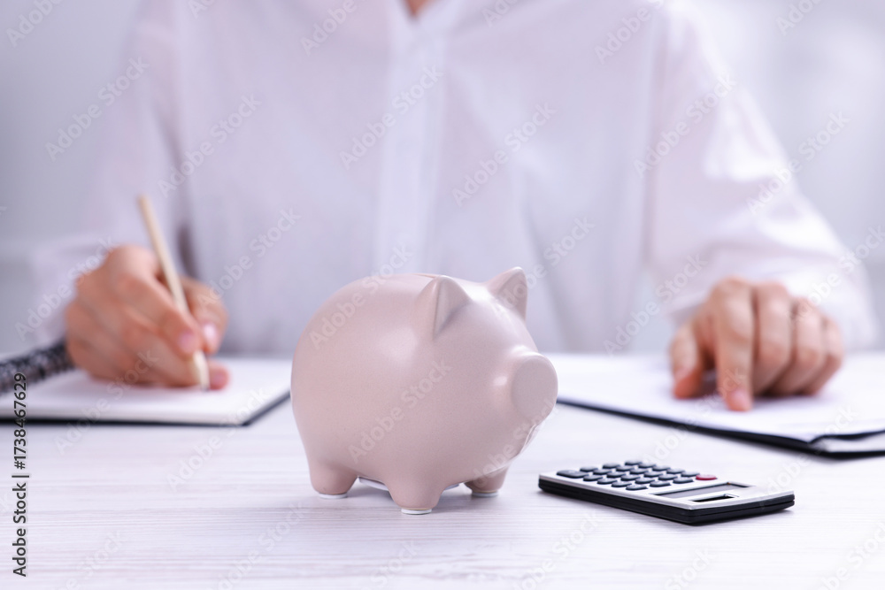 Piggy bank with calculator on white wooden table and woman working indoors, selective focus