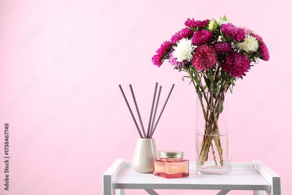 Beautiful flowers in vase, candle and incense sticks on white stand against pink background. Space for text
