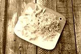 Dried shredded squid and shavings on color wooden table, top view