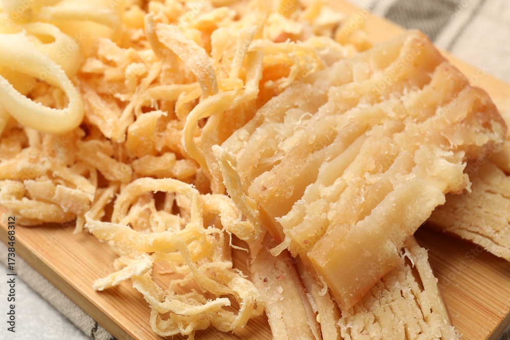 Different tasty dried squid on table, closeup