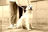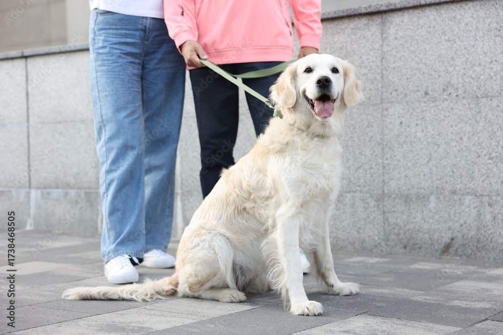 Senior couple with adorable Golden Retriever dog outdoors, closeup