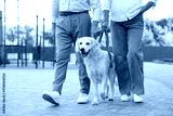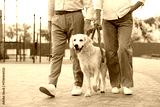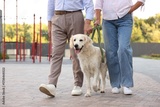 Senior couple walking with adorable Golden Retriever dog outdoors, closeup