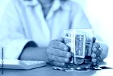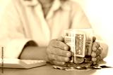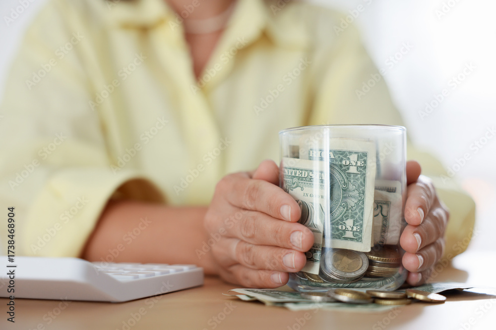 Woman with glass jar of money and calculator at desk indoors, selective focus