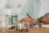 Glass jars with money and woman budgeting at wooden desk, selective focus