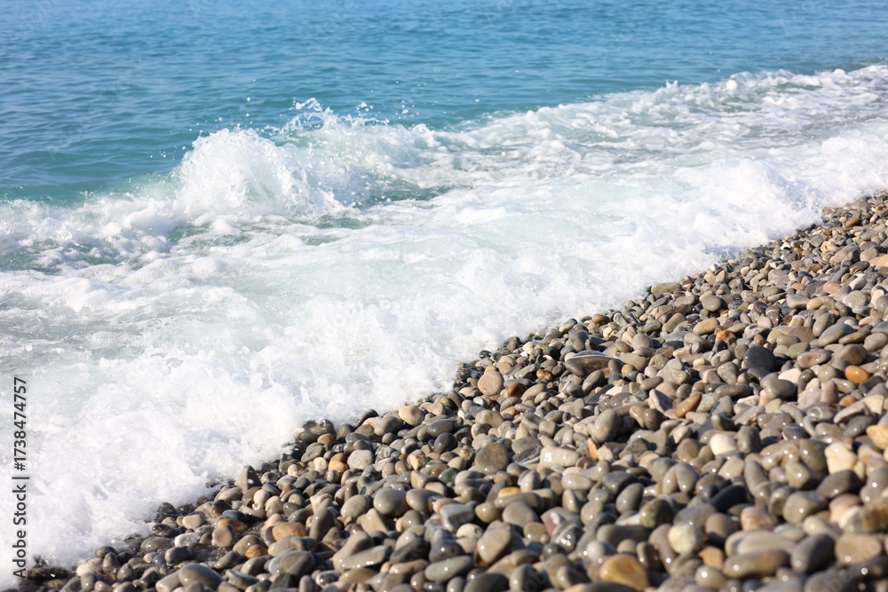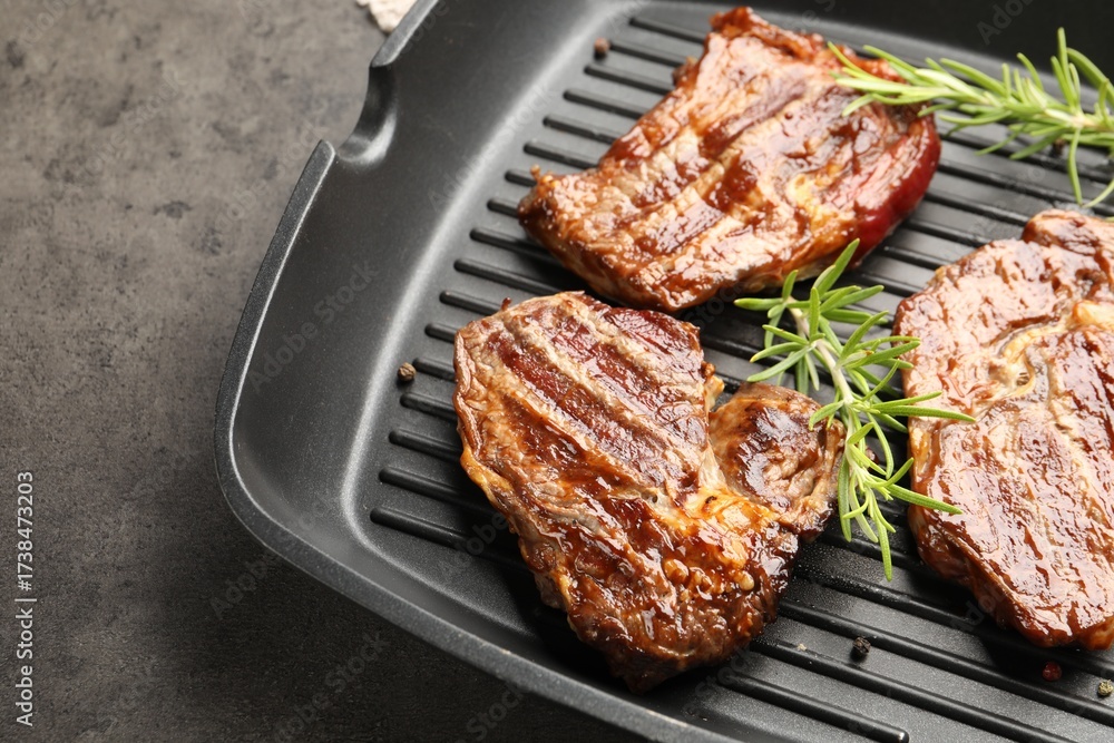 Pan with grilled beef steaks and rosemary on grey textured table, closeup