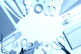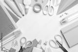 Frame of glue and other stationery on white background, flat lay. Space for text