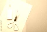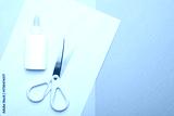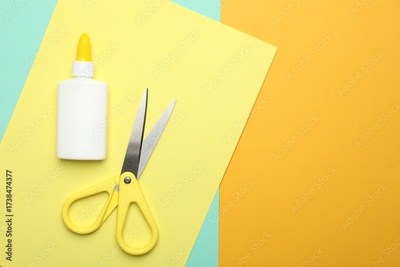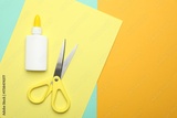 Glue, scissors and color paper on yellow background, flat lay. Space for text
