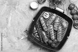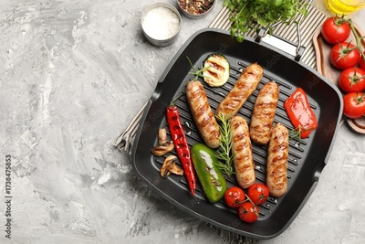 Pan with grilled sausages, vegetables, mushrooms and spices on gray textured table, flat lay. Space for text