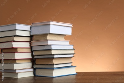 Stacks of many books on wooden table against light brown background, space for text
