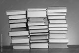 Stacks of many books on wooden table against light brown background