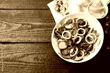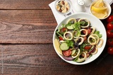 Delicious salad with squid rings and vegetables served on wooden table, flat lay. Space for text