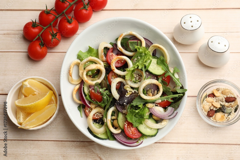 Delicious salad with squid rings and vegetables served on wooden table, flat lay