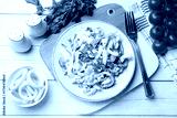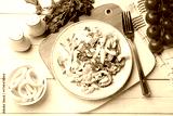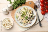 Tasty salad with squid rings, onion and eggs served on light wooden table, flat lay