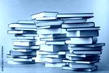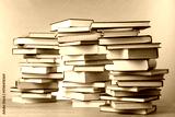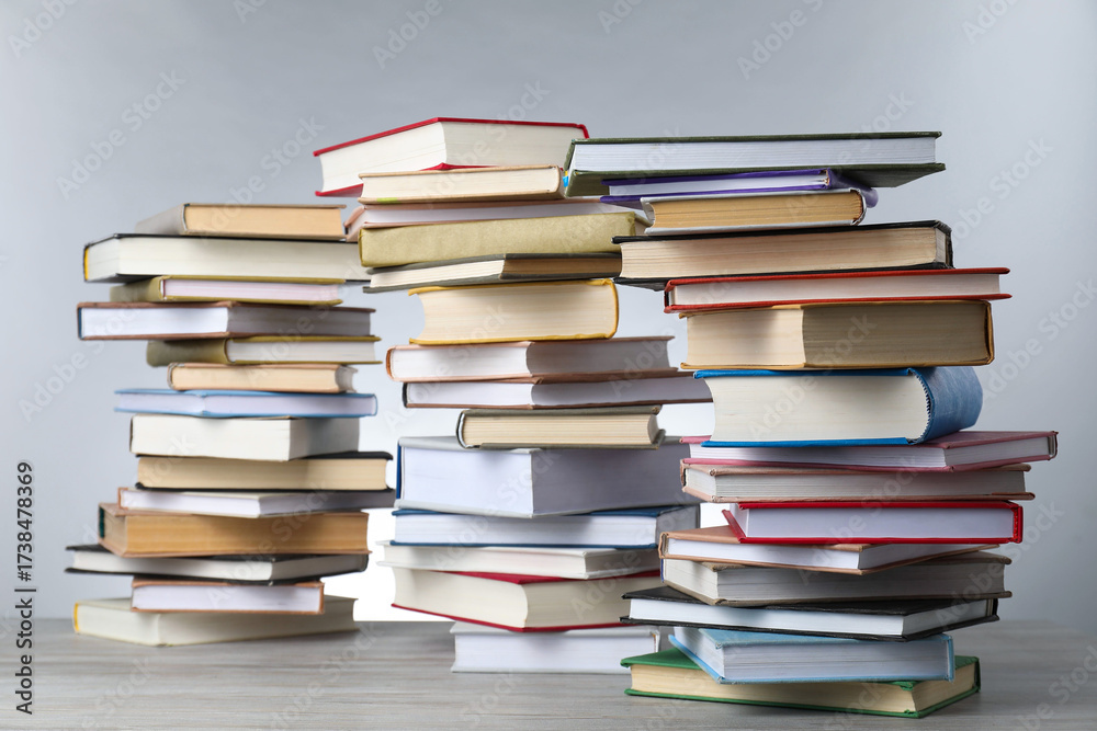 Many stacked books on table against light grey background