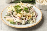 Tasty salad with squid rings, onion and eggs served on light grey table, closeup