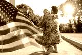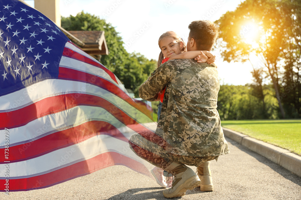 Military man and his daughter outdoors, double exposure with national flag of USA
