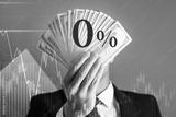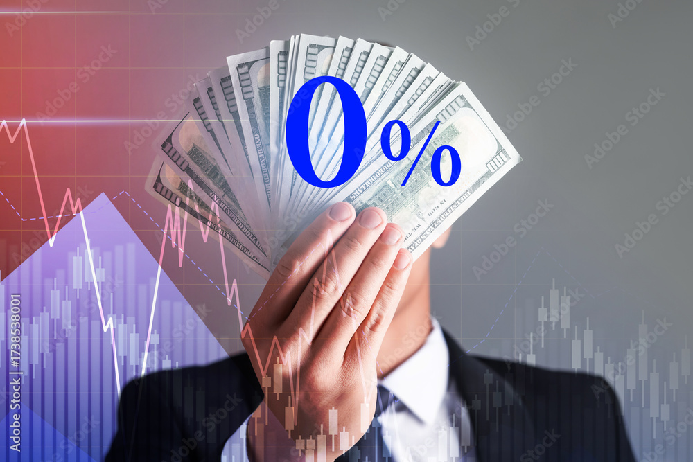 Zero percent commission. Man holding dollars and graphs against grey background, closeup