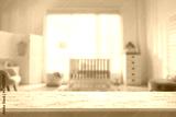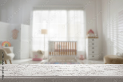 Baby room with empty white table. Space for design