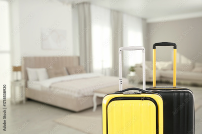 Spacious hotel room with comfortable furniture and guest suitcases, selective focus