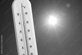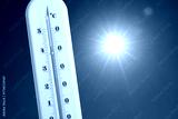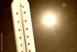 Thermometer showing high temperature against sky with bright sun. Extremely hot weather