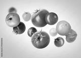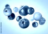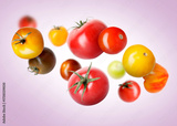 Different fresh tomatoes falling against light violet background